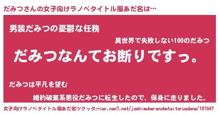 男性向けラノベタイトル風あだ名 | 『魔法科高校のだみつ』 |
