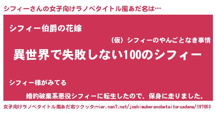 | 男性向けラノベタイトル風あだ名 | 『シフィーという概念が存在しない退屈な世界 』 |