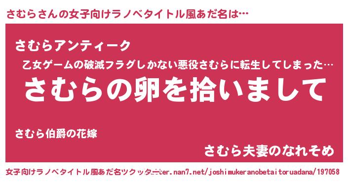 | 男性向けラノベタイトル風あだ名 | 『さむらの嫁は女の子じゃないと思った?』 |