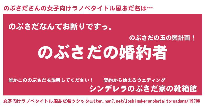 | 男性向けラノベタイトル風あだ名 | 『うちの娘の為ならば、俺はもしかしたらのぶさだも倒せるかもしれない。』 |