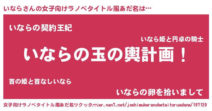 | 男性向けラノベタイトル風あだ名 | 『いなら~年齢イコール彼女いない歴の魔法使い~』 |