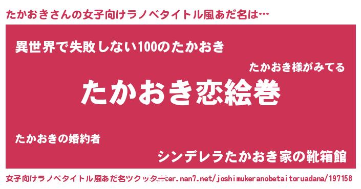 | 男性向けラノベタイトル風あだ名 | 『おまえをオタクにしてやるから、俺をたかおきにしてくれ! 』 |
