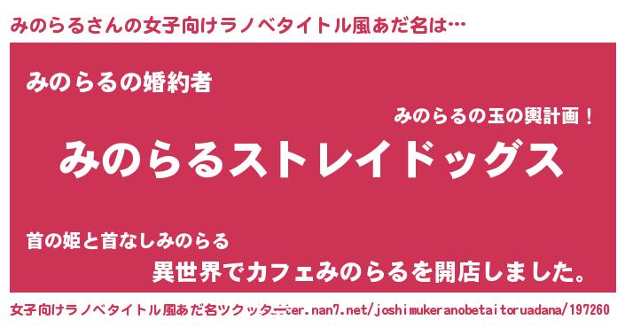 | 男性向けラノベタイトル風あだ名 | 『Re:みのらるから始める異世界生活』 |