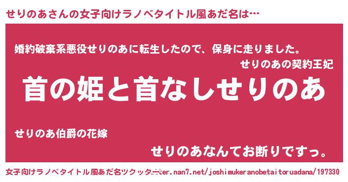 | 男性向けラノベタイトル風あだ名 | 『はたらくせりのあさま!』 |