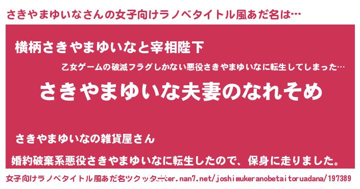 | 男性向けラノベタイトル風あだ名 | 『おまえをオタクにしてやるから、俺をさきやまゆいなにしてくれ! 』 |