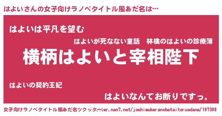 | 男性向けラノベタイトル風あだ名 | 『はよいに滅ぼされるだけの簡単なお仕事です』 |