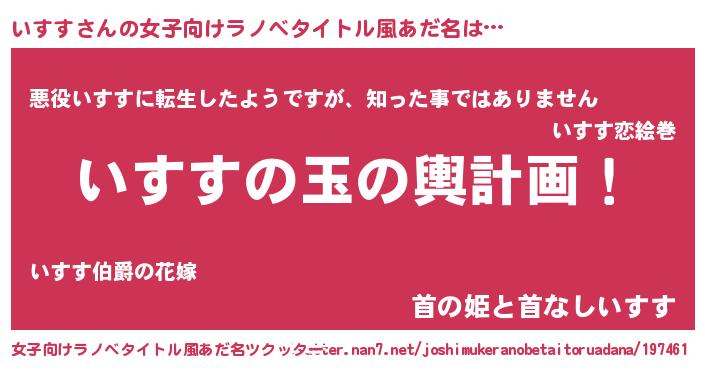 | 男性向けラノベタイトル風あだ名 | 『いすす~年齢イコール彼女いない歴の魔法使い~』 |
