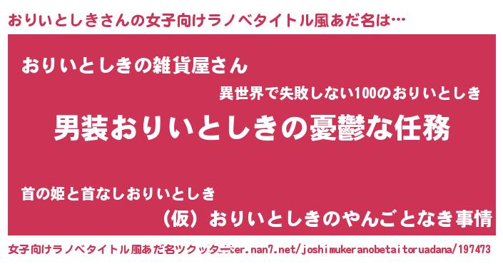 | 男性向けラノベタイトル風あだ名 | 『うちのおりいとしきが世界を掌握している!』 |