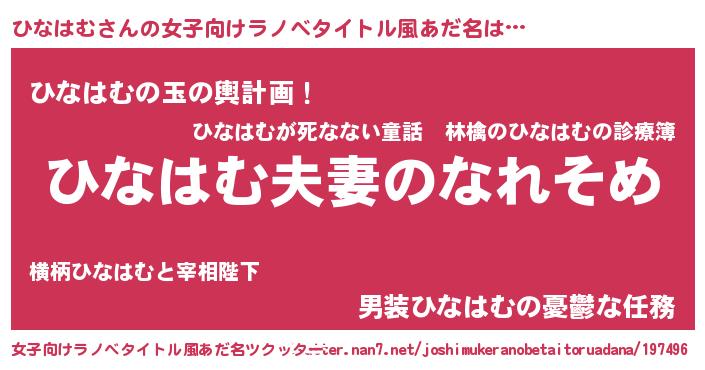 | 男性向けラノベタイトル風あだ名 | 『おまえをオタクにしてやるから、俺をひなはむにしてくれ! 』 |