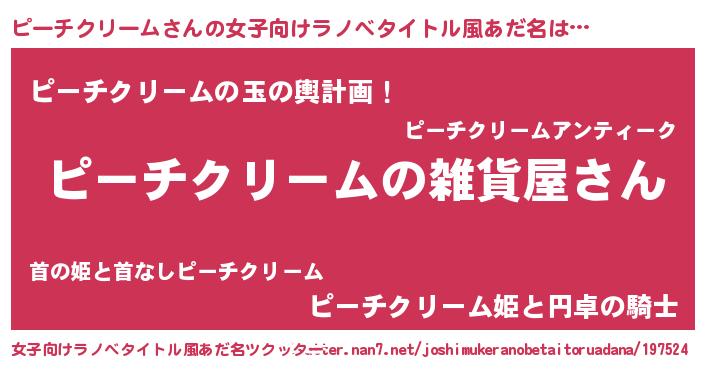 ピーチクリームさんの女子向けラノベタイトル風あだ名は… 『ピーチクリームの雑貨屋さん』『ピーチクリームの玉の輿計画!』『ピーチクリーム姫と円卓の騎士』 ツクッター #女子向けラノベタイトル風あだ名ツクッター http://tkutter.nan7.net/joshimukeranobetaitoruadana/197524/