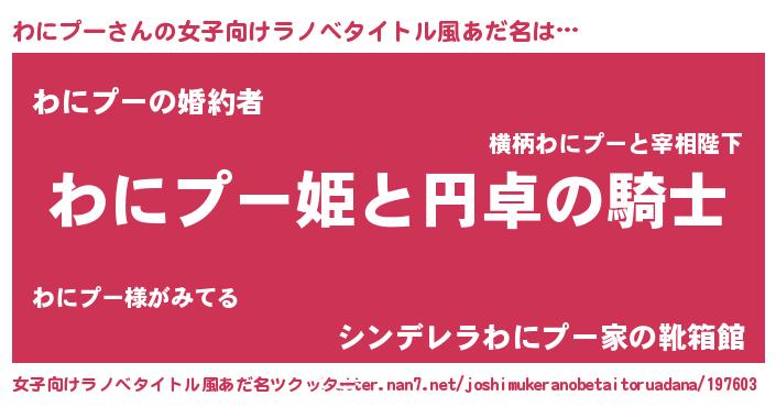 | 男性向けラノベタイトル風あだ名 | 『わにプーの憂鬱』『緋弾のワニプー』 |