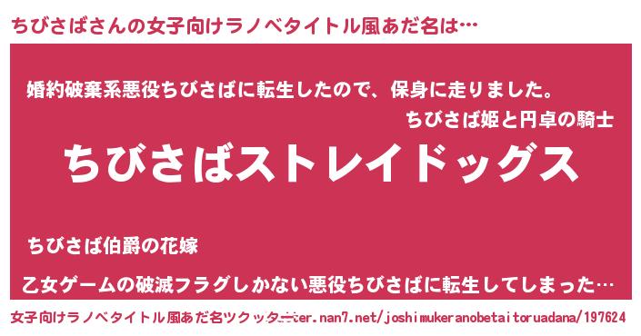 | 男性向けラノベタイトル風あだ名 | 『Re:ちびさばから始める異世界生活』 |