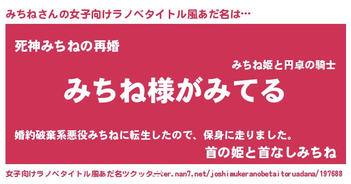 | 男性向けラノベタイトル風あだ名 | 『みちねの嫁は女の子じゃないと思った?』 |