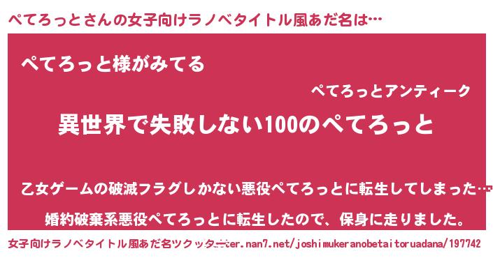 | 男性向けラノベタイトル風あだ名 | 『ぺてろっとという概念が存在しない退屈な世界 』 |
