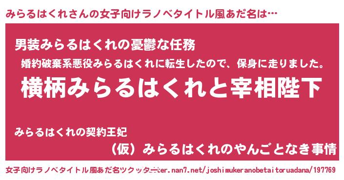 | 男性向けラノベタイトル風あだ名 | 『みらるはくれに滅ぼされるだけの簡単なお仕事です』 |
