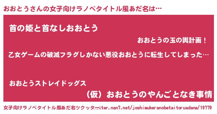 | 男性向けラノベタイトル風あだ名 | 『魔弾の王とおおとう』『おおとうの憂鬱』 |