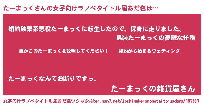 たーまっくさんの女子向けラノベタイトル風あだ名は… 『誰かこのたーまっくを説明してください! ~契約から始まるウェディング~』『婚約破棄系悪役たーまっくに転生したので、保身に走りました。』『たーまっくの雑貨屋さん』 ツクッター #女子向けラノベタイトル風あだ名ツクッター http://tkutter.nan7.net/joshimukeranobetaitoruadana/197807/