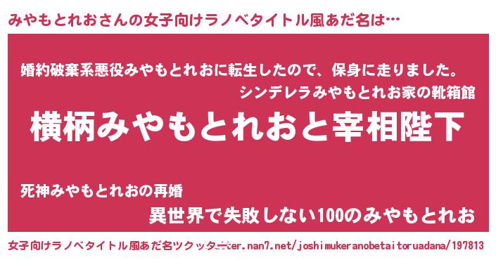 みやもとれおさんの女子向けラノベタイトル風あだ名は… 『横柄みやもとれおと宰相陛下』『婚約破棄系悪役みやもとれおに転生したので、保身に走りました。』『異世界で失敗しない100のみやもとれお』 ツクッター #女子向けラノベタイトル風あだ名ツクッター http://tkutter.nan7.net/joshimukeranobetaitoruadana/197813/
