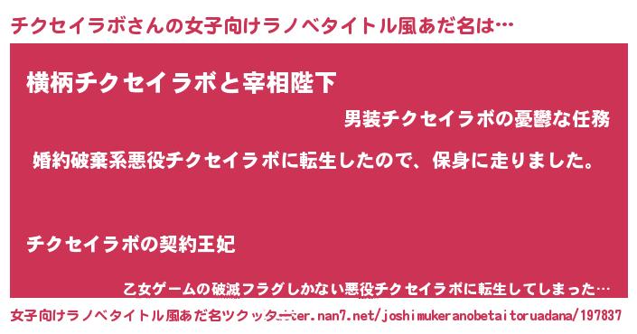 | 男性向けラノベタイトル風あだ名 | 『チクセイラボスレイヤー』 |