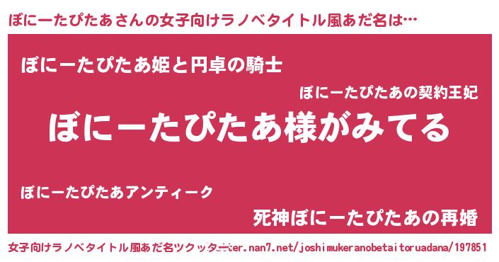 | 男性向けラノベタイトル風あだ名 | 『ぼにーたぴたあの嫁は女の子じゃないと思った?』 |
