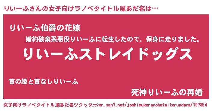 りいーふさんの女子向けラノベタイトル風あだ名は… 『りいーふストレイドッグス』『りいーふ伯爵の花嫁』『死神りいーふの再婚』 ツクッター #女子向けラノベタイトル風あだ名ツクッター http://tkutter.nan7.net/joshimukeranobetaitoruadana/197854/
