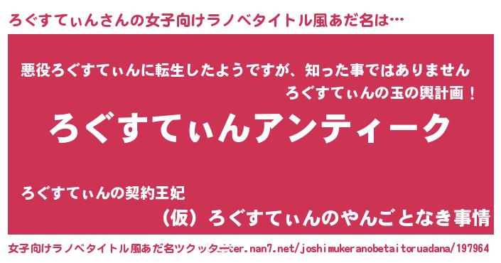 ろぐすてぃんさんの女子向けラノベタイトル風あだ名は… 『ろぐすてぃんアンティーク』『悪役ろぐすてぃんに転生したようですが、知った事ではありません』『(仮)ろぐすてぃんのやんごとなき事情』 ツクッター #女子向けラノベタイトル風あだ名ツクッター http://tkutter.nan7.net/joshimukeranobetaitoruadana/197964/