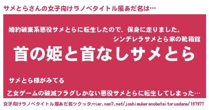 | 男性向けラノベタイトル風あだ名 | 『はたらくサメとらさま!』 |