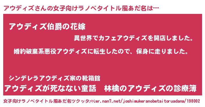 | 男性向けラノベタイトル風あだ名 | 『転生したらアウディズだった件』 |