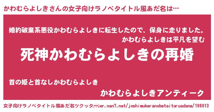 かわむらよしきさんの女子向けラノベタイトル風あだ名は… 『死神かわむらよしきの再婚』『婚約破棄系悪役かわむらよしきに転生したので、保身に走りました。』『かわむらよしきアンティーク』 ツクッター #女子向けラノベタイトル風あだ名ツクッター http://tkutter.nan7.net/joshimukeranobetaitoruadana/198013/