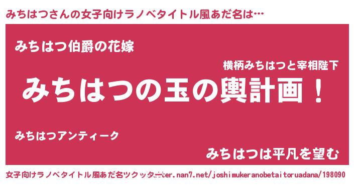 | 男性向けラノベタイトル風あだ名 | 『みちはつ~年齢イコール彼女いない歴の魔法使い~』 |