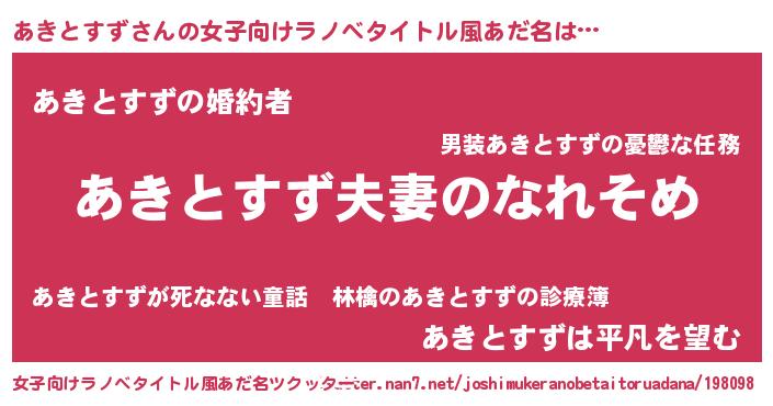 | 男性向けラノベタイトル風あだ名 | 『おまえをオタクにしてやるから、俺をあきとすずにしてくれ! 』 |