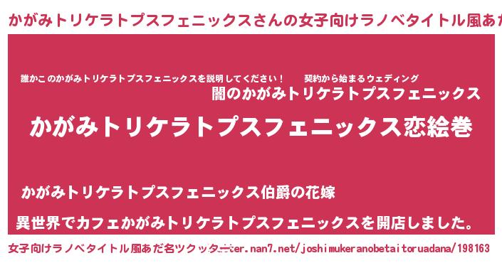 | 男性向けラノベタイトル風あだ名 | 『ノーゲーム・ノーカガミトリケラトプスフェニックス』 |