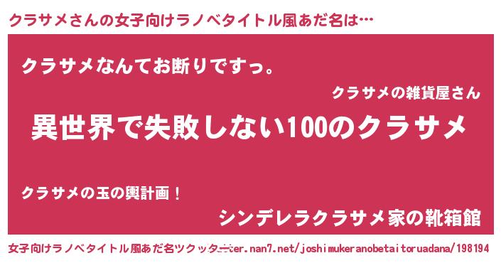 | 男性向けラノベタイトル風あだ名 | 『クラサメという概念が存在しない退屈な世界 』 |