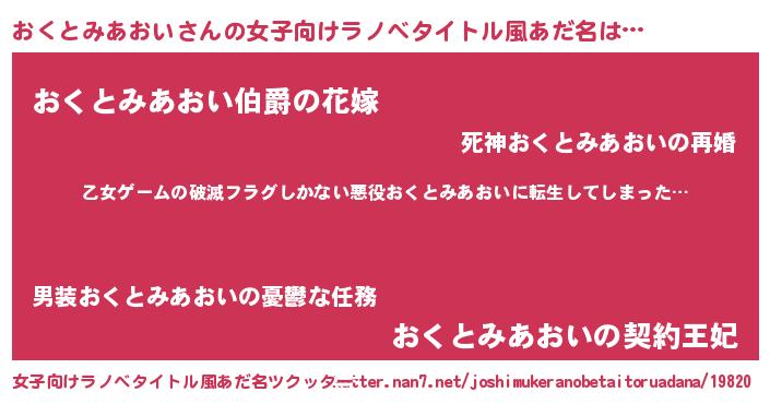 | 男性向けラノベタイトル風あだ名 | 『この素晴らしい世界におくとみあおいを!』 |