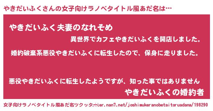 | 男性向けラノベタイトル風あだ名 | 『ヤキダイフクスレイヤー』 |