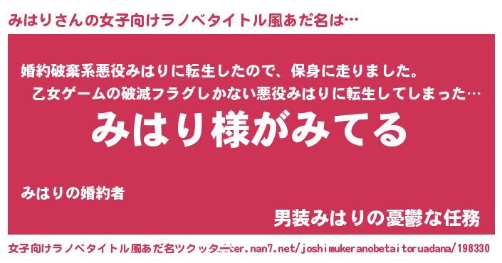 | 男性向けラノベタイトル風あだ名 | 『みはりの嫁は女の子じゃないと思った?』 |