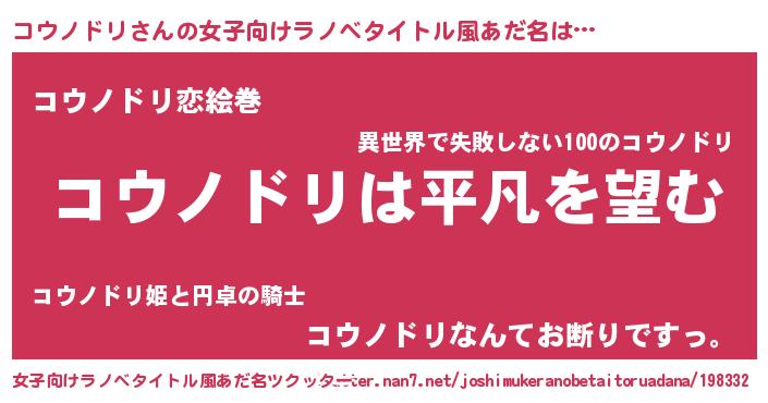 | 男性向けラノベタイトル風あだ名 | 『ダンジョンにコウノドリを求めるのは間違っているだろうか』 |