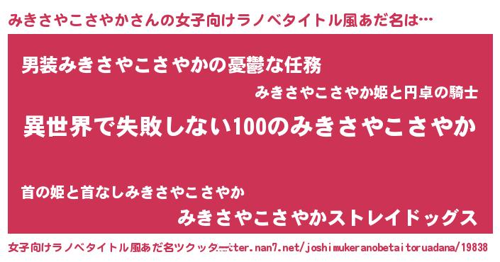| 男性向けラノベタイトル風あだ名 | 『みきさやこさやかという概念が存在しない退屈な世界 』 |