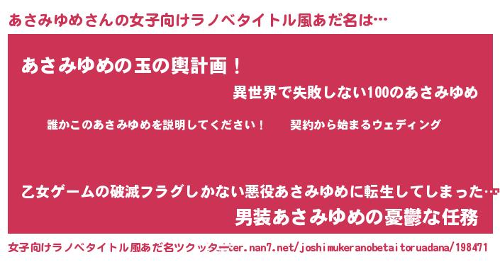 | 男性向けラノベタイトル風あだ名 | 『アサミユメアートオンライン』 |