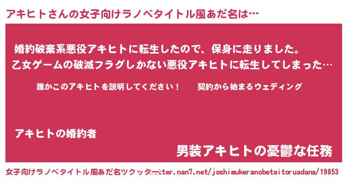 | 男性向けラノベタイトル風あだ名 | 『アキヒトアートオンライン』 |