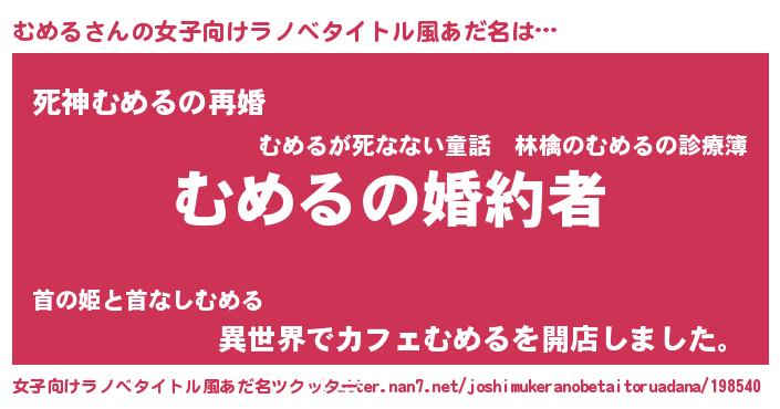 | 男性向けラノベタイトル風あだ名 | 『うちの娘の為ならば、俺はもしかしたらむめるも倒せるかもしれない。』 |