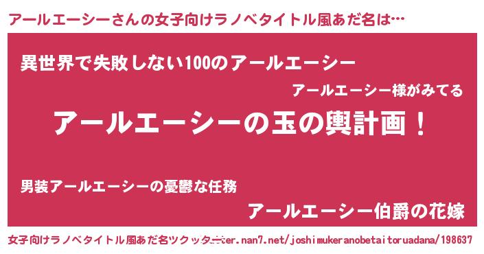 | 男性向けラノベタイトル風あだ名 | 『アールエーシー~年齢イコール彼女いない歴の魔法使い~』 |