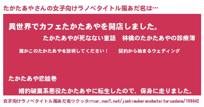 | 男性向けラノベタイトル風あだ名 | 『タカタアヤアートオンライン』 |
