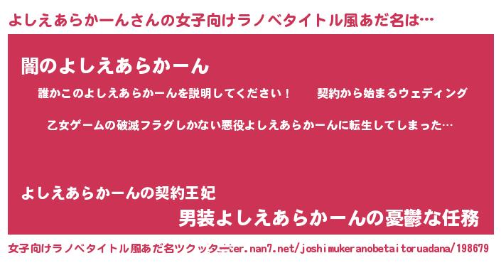 | 男性向けラノベタイトル風あだ名 | 『魔弾の王とよしえあらかーん』 |