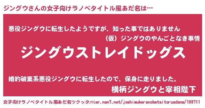 | 男性向けラノベタイトル風あだ名 | 『Re:ジングウから始める異世界生活』 |