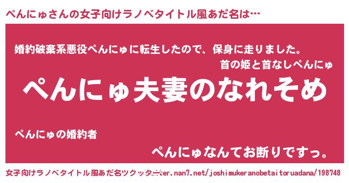 | 男性向けラノベタイトル風あだ名 | 『おまえをオタクにしてやるから、俺をぺんにゅにしてくれ! 』 |