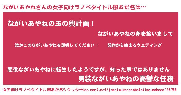 ながいあやねさんの女子向けラノベタイトル風あだ名は… 『誰かこのながいあやねを説明してください! ~契約から始まるウェディング~』『ながいあやねの玉の輿計画!』『男装ながいあやねの憂鬱な任務』 ツクッター #女子向けラノベタイトル風あだ名ツクッター http://tkutter.nan7.net/joshimukeranobetaitoruadana/198766/