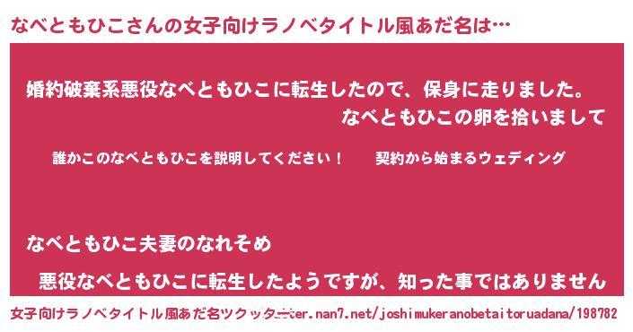 | 男性向けラノベタイトル風あだ名 | 『ナベトモヒコアートオンライン』 |
