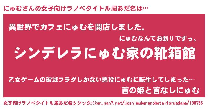 にゅむさんの女子向けラノベタイトル風あだ名は… 『シンデレラにゅむ家の靴箱館』『異世界でカフェにゅむを開店しました。』『首の姫と首なしにゅむ』 ツクッター #女子向けラノベタイトル風あだ名ツクッター http://tkutter.nan7.net/joshimukeranobetaitoruadana/198785/