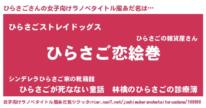 | 男性向けラノベタイトル風あだ名 | 『おまえをオタクにしてやるから、俺をひらさごにしてくれ! 』 |